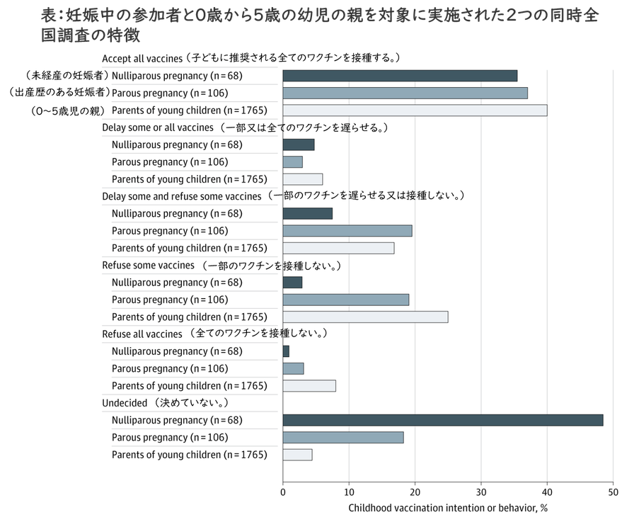 子供に推奨されるすべてのワクチンを受け入れる、または受け入れるつもりの割合は、妊娠中の参加者と親の間で同様でした(表)。子供に対するワクチンの一部または全部を(遅滞なく)拒否する意思がある割合は、未経産の妊娠参加者(68人中5人[4%])で最も低く、親(1765人中391人[33%])で最も高かった。小児期のワクチン接種に関する不確実性は、未経産の妊娠中の参加者(68人中31人[48%])で最も高く、幼児の親(1765人中78人[4%])で最も低かった。